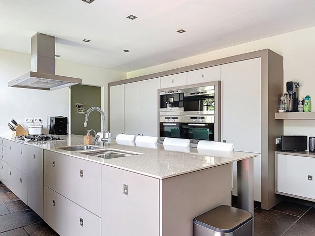 Keuken ca. 23 m²- zwarte natuursteen - Miele keuken met 2 combi ovens, steamer, espresso apparaat, koelkast en diepvrie, gasvuur, dampkap en vaatwasser