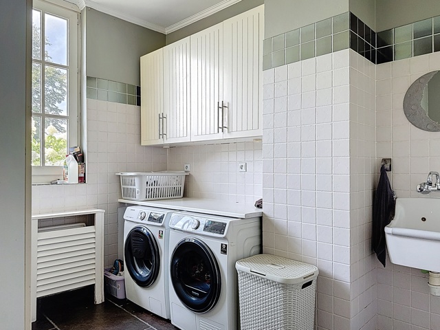 Wasplaats/toilet ca. 10 m² - zwarte tegelvloer - spoeltafel - aansluiting wasmachine en droogkast
