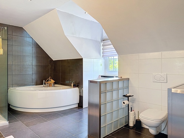 Badkamer 2 ca. 23 m² - zwarte tegelvloer - bronzen wandtegels - jacuzzi - douche - dubbel lavabomeubel - toilet