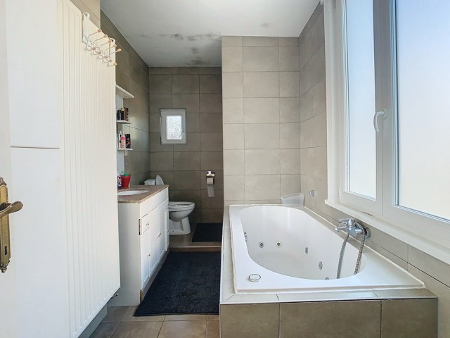 Badkamer ca. 8 m² - taupekleurige tegelvloer en wandtegels - toilet - ligbad - douche - lavabomeubel - ingemaakte kast